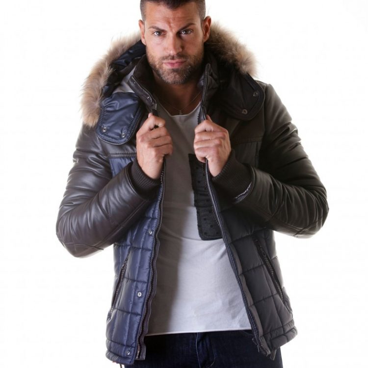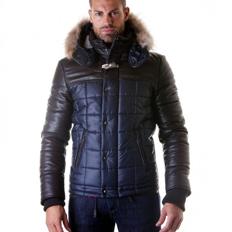 Genuine hood leather jacket, fur murmasky, central zip, leather and fabric, smooth soft leather, blue/brown color
